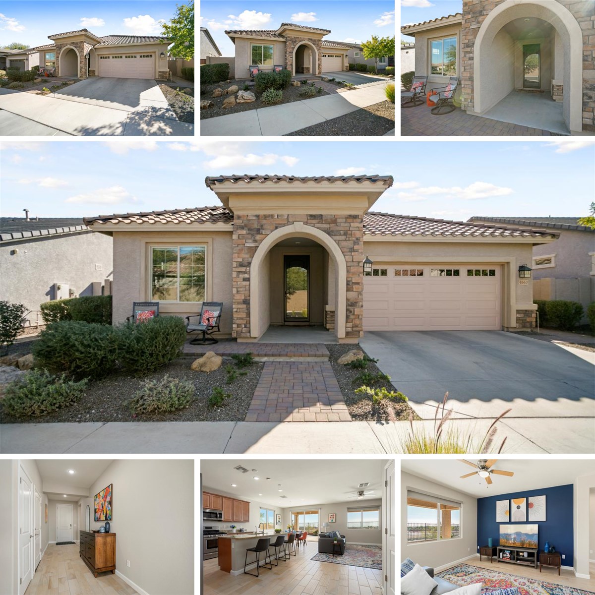 Located in the vibrant 55+ active adult community of Victory at Verrado, this beautifully upgraded single-story residence offers a perfect blend of comfort and modern living. As you enter, you'll find two spacious bedrooms at the front, complete with an adjacent full bathroom, providing privacy and convenience for guests or family. This home boasts three bedrooms and two baths, providing ample space for family and visitors. The pavers the sidewalk and front porch enhance the curb appeal, while the travertine back patio offers a luxurious outdoor living space for entertaining or unwinding. The heart of the home is the inviting main living area, seamlessly connected to a charming back patio, perfect for enjoying Arizona's stunning sunsets.